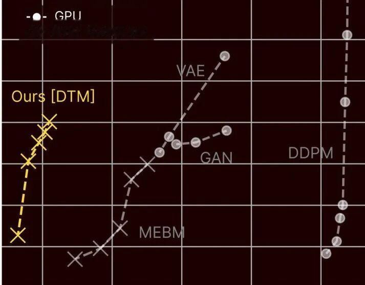 根据论文中的数据,Extropic 团队开发的 DTM 架构在简单图像生成基准测试上已经显示出惊人的能效。他们使用一个仅包含 70×70 采样单元的网格,成功生成了来自 Fashion-MNIST 数据集的低分辨率灰度服装图像。论文中的对比图显示,在相同的性能水平下,DTM 在 TSU 上的能耗比在 GPU 上运行的传统方法低约一万倍。