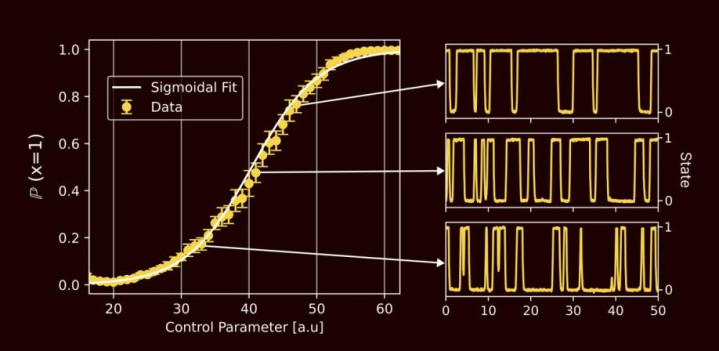 传统的比特在任何时刻都只有两个明确的状态:0 或 1。而 p-bit 则利用晶体管内在的热噪声,使其在 0 和 1 之间自然地、概率性地波动。这种设计使得 TSU 能够原生、高效地执行概率算法,尤其是生成式 AI 模型中常见的采样任务。
