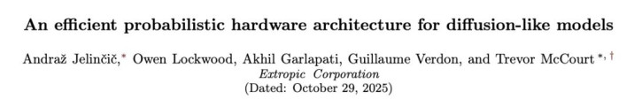 根据 Extropic 于 2025 年 10 月 28 日在学术预印本网站 arXiv 上发布的论文《一种用于类扩散模型的高效概率硬件架构》(An efficient probabilistic hardware architecture for diffusion-like models),其设计的全晶体管概率计算机,在运行他们提出的“去噪热力学模型”(Denoising Thermodynamic Model,DTM)时,相较于在 GPU 上运行的同类算法,能在达到同等性能水平(performance parity)的前提下,将能耗降低约 10,000 倍。